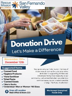 Our volunteer students are organizing a winter donation drive. Please see attached flyer for needed items. All donations will be given to the San Fernando Valley Rescue Mission in Northridge. Thank you for your generosity!